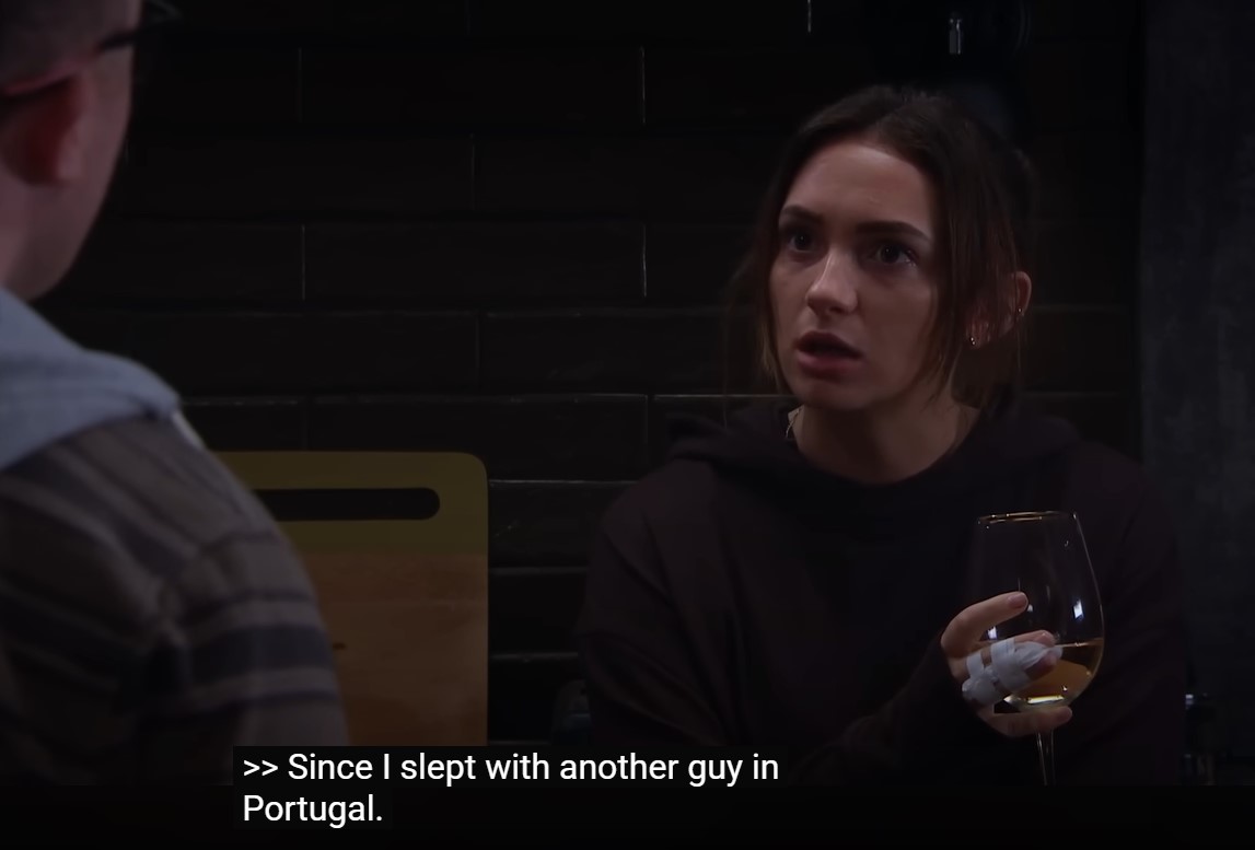 That thought planted seeds of doubt in Gabby’s mind — doubt that connected uncomfortably with her own choices. Tearfully, she confessed to Laurel that she had slept with another man while in Portugal, blaming her actions on confusion. Later, she admitted to Vinny that the confession had been a weapon — something she said only to hurt him.